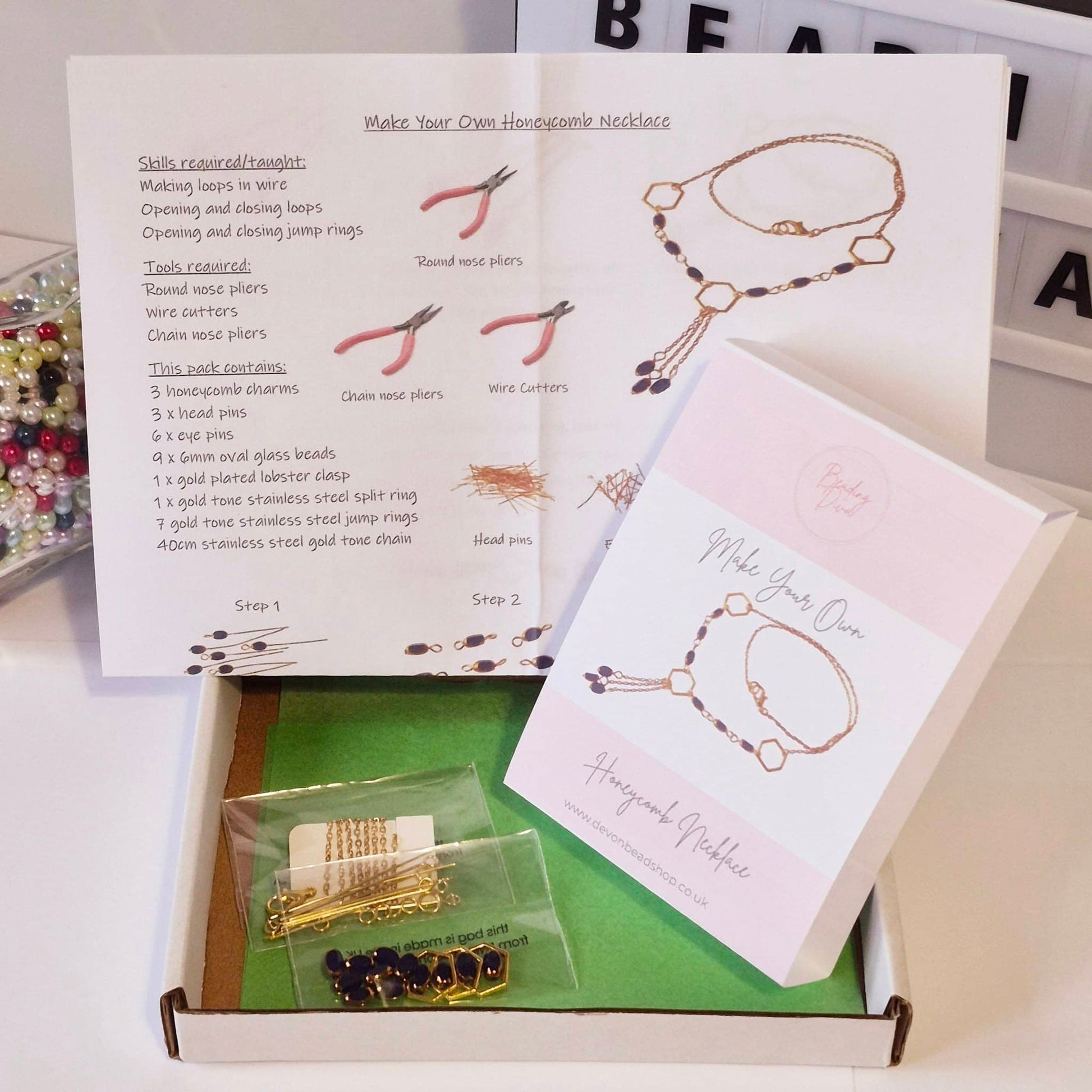 This pack contains everything you need to make your own honeycomb necklace, choose from Navy, Sky Blue, Honeydew and Thistle.