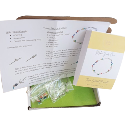 Contains a random mix of 4mm bicone beads along with all the materials needed to make your own bracelet and full colour instructions.